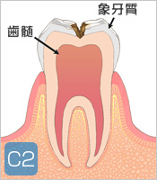 C2:エナメル質を越えて象牙質まで進行したむし歯の状態です。