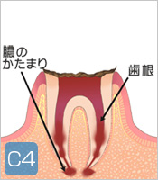 C4:歯の頭がほとんど崩壊、根のみが残った状態で、