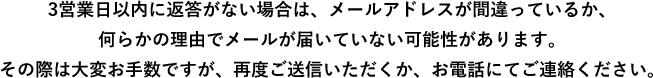 メールでお問合せいただいた場合、返信が多少遅くなることもございますのであらかじめご了承ください。お急ぎの方はお電話にてお問合せください。
